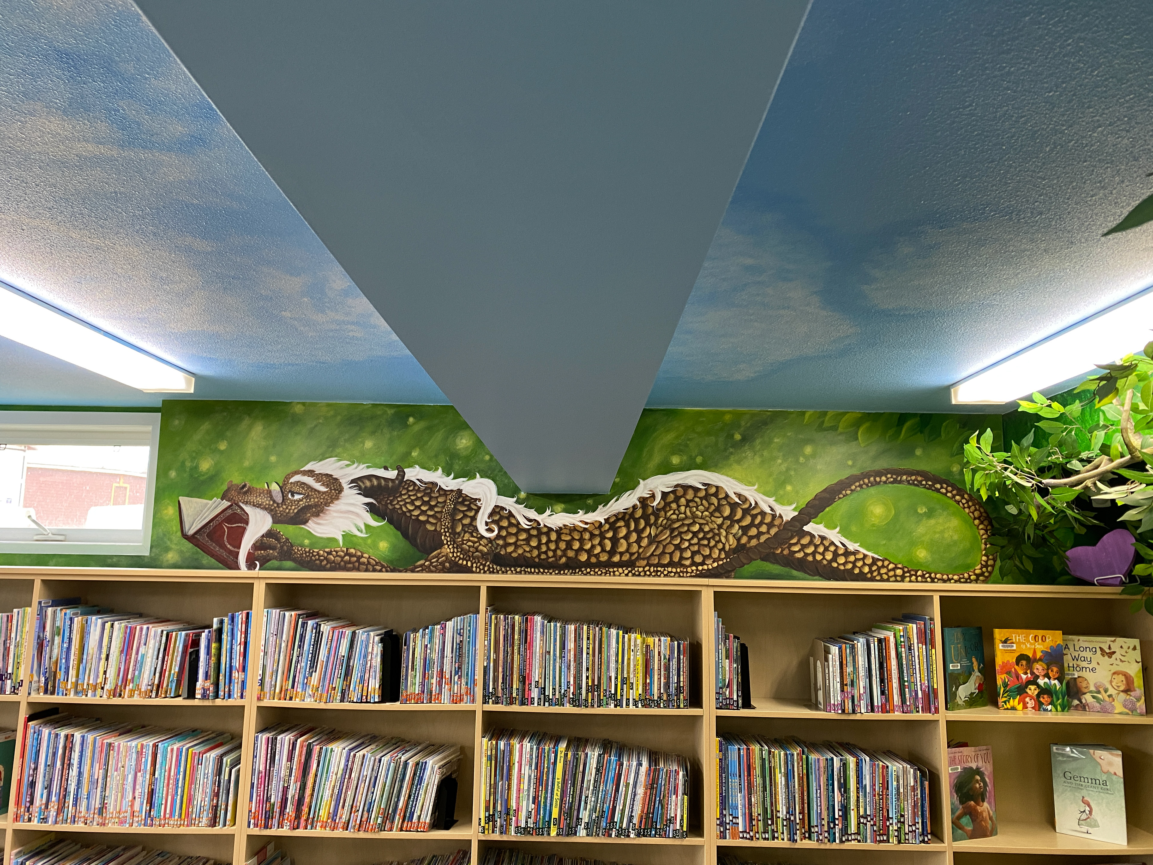 I was tasked with designing and painting a dragon that is reading a book while resting on top of a bookcase. This was quite challenging for me, as I had never painted on such a large surface before. To approach this project, I started by taking a straight-on photograph of the space where the dragon would be located. I then imported the photograph into Photoshop, where I began designing the dragon over the reference image. This allowed me to experiment with different dragon designs while ensuring the correct size and proportions. Once I was satisfied with the design, I proceeded to sketch it onto the surface where this magnificent creature would eventually be painted.